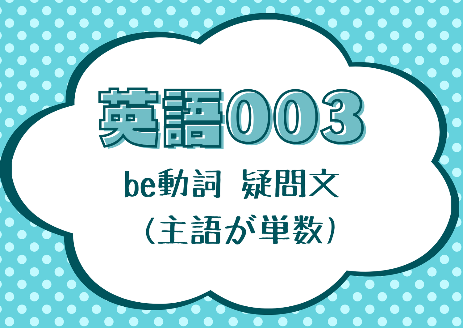 英語003 「be動詞 疑問文 (主語が単数)」 2026 1/22 English 英語 2025-12-302026-01-22 英語003 「be動詞 疑問文 (主語が単数)」ダウンロード English 英語 よかったらシェアしてね! URLをコピーしました! URLをコピーしました! 英語002' 「be動詞 否定文(主語が単数) 短縮形」 英語003' 「be動詞 疑問文 (主語が単数) 返答が短縮形」 この記事を書いた人 MatsuoNobuya 代表 トモコラボ 代表 神戸市在住 3児の父 20代は民間企業で、30歳から教師に 趣味は低山ハイキング、水泳、美術館に訪れること 関連記事 英語023 「疑問詞③〈When〉 2026-01-24 英語022 「疑問詞②〈What〉一般動詞」 2026-01-24 英語021 「疑問詞①」 2026-01-22 英語020 「文の途中にある情報(副詞)」 2026-01-22 英語019 「文の後ろにつける情報(前置詞)」 2026-01-22 英語018 「文の後ろにつける情報(副詞)」 2026-01-22 英語017 「名詞につく持ち主を表すことば(所有格)」 2026-01-22 英語016 「名詞につけるa,an」 2026-01-22